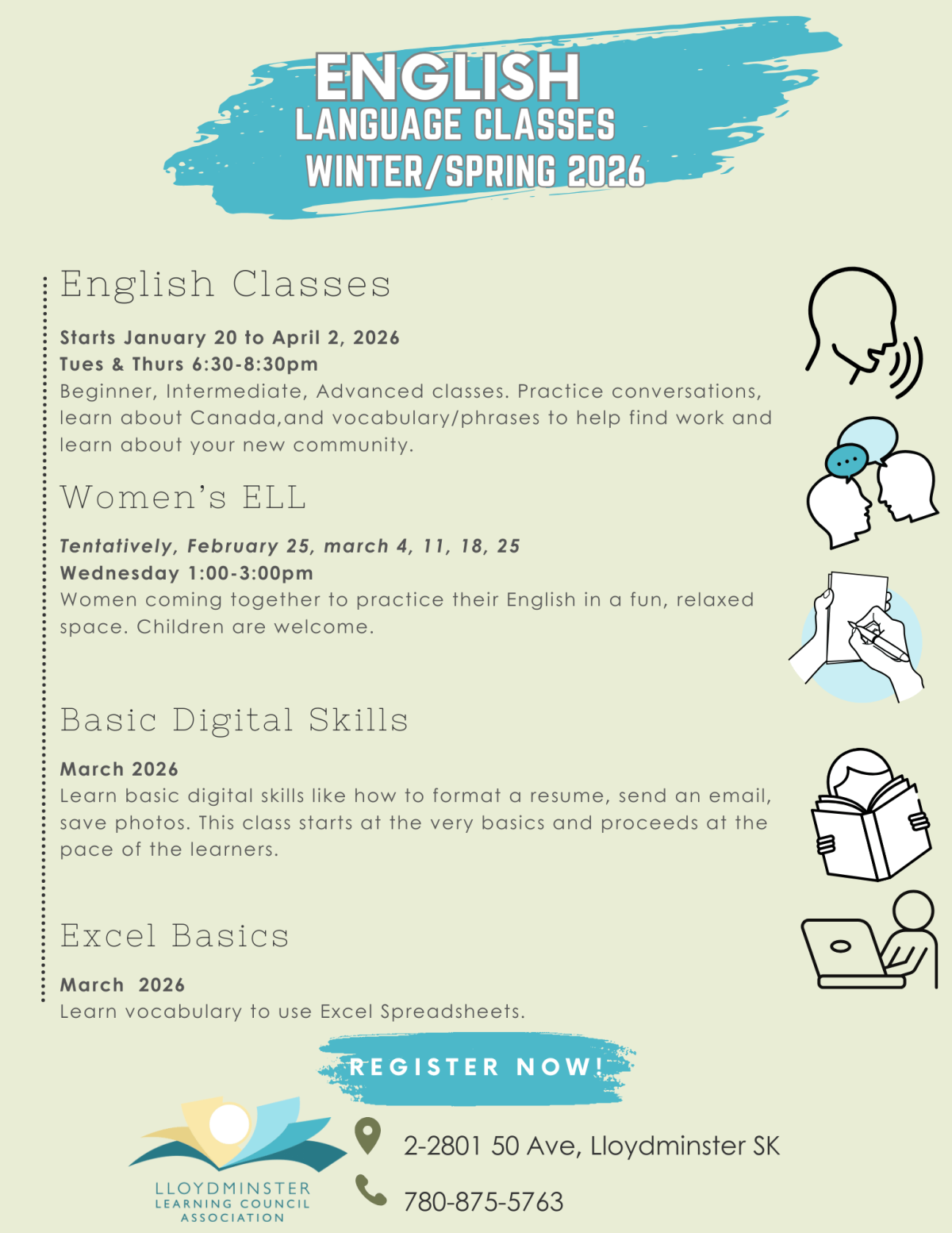 Learn to speak English is a fun and relaxed way. Classes start in September and run for 10 weeks, and the winter term begins in January. Classes are Tuesday and Thursday evenings at Lakeland College, from 6:30pm to 8:30pm. Please come to the office to register and you will do a test to place you in the class.